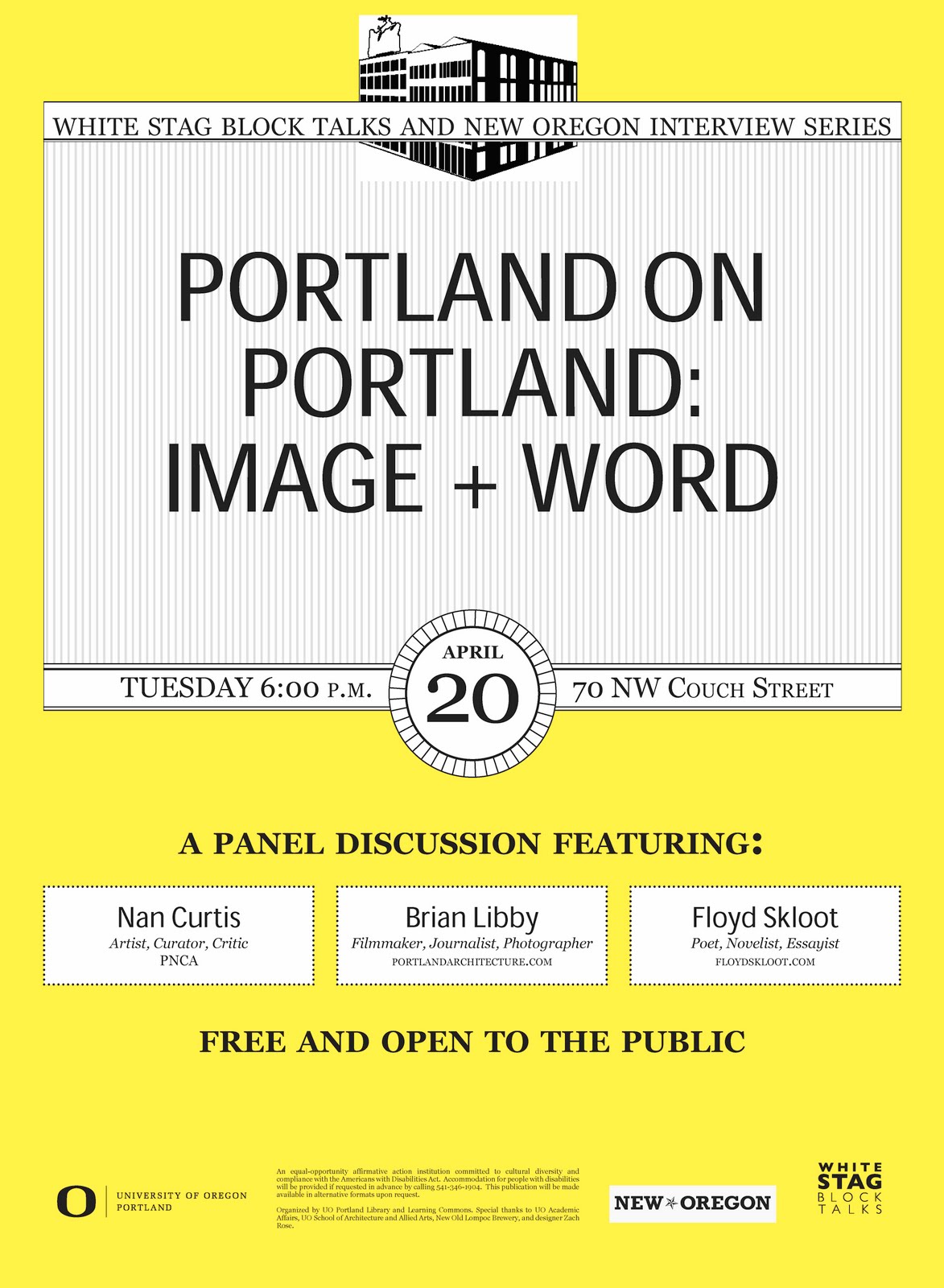 Artist/curator Nan Curtis, filmmaker/architecture critic Brian Libby and writer Floyd Skloot with host Nora Robertson dig into how Portland’s identity is reflected in art locally and to the outside world. The New Oregon Interview Series joins the White Stag Block Talk in exploring Portland’s evolving creative culture and how it is in conversation with other regions. University of Oregon White Stag Block, 70 NW Couch St., Tuesday, April 20th, 6-8 PM, open wine and beer bar, FREE.