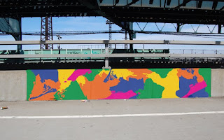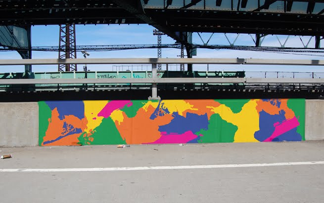 The design, NYCamo, is a brightly colored camouflage pattern based on the shapes of the five boroughs of New York City. The commission was awarded by the NYC Department of Transportation Urban Art Program.