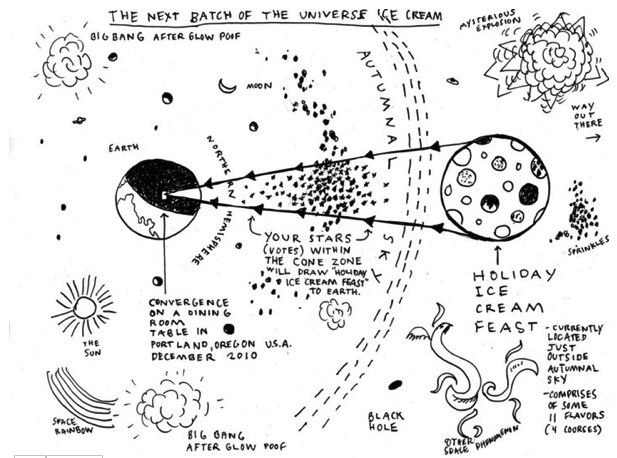 Psychedelic sweets, tender moments, music, honoring the past, daydreaming of the future: September 22nd 6-8 @ the old cart spot on the grassy lot at 4734 N. Albina in Portland, Oregon. Free pints of Universe Ice Cream for buyers of the book. —Elizabeth Pusack